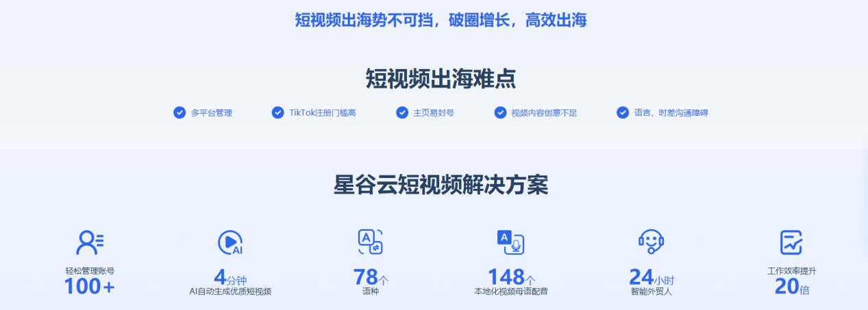 针对 TikTok 等短视频平台,星谷云提供了全流程解决方案。其海外视频账号管理功能支持 TikTok、Facebook Reels 等多平台统一绑定;移动 APP 允许企业随时随地拍摄产品视频、厂房风貌等素材并上传至素材库,AI 可快速识别素材内容。智能 AI 视频制作功能支持语音指令与文本输入,用户只需设定主题、语言、目标市场等参数,AI 便会自动挑选素材、撰写脚本、剪辑配音,4 分钟内生成专业短视频。同时,多语言、多音色的 AI 数字人可增强视频感染力,帮助企业建立用户信任;智能 24 小时外贸人则能及时响应短视频平台的客户咨询,精准筛选意向客户。